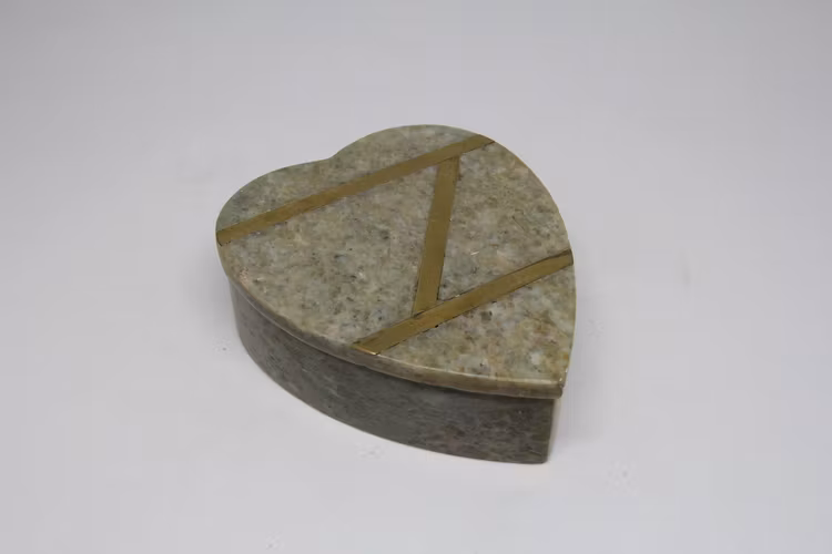 Hjärtformad lockask i sten, intarsia med mässingsränder 0 kr 69 kr Längd 11 cm, bredd 9 cm, höjd 3 cm. Handgjorda så mindre variationer förekommer i färg och mått. Flera populära produkter Vackert dekorerad oval ask med lock i sten 49 kr Ljushållare i sten, i form av krokodil, handgjord 19 kr Vackert dekorerad ask med påfågelmotiv och lock i sten 49 kr Vacker rektangulär lockask med orm-motiv, i sten 79 kr