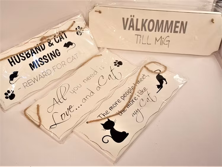 Skyltar i trä med kattmotiv, x1 Text Välkommen... The more... All you... Husband & cat... 129 kr 69 kr 4 motiv att välja mellan. Mått 30x10 cm och 25x10 cm. Flera populära produkter Hjärtformad ask med änglamotiv från 5 kr Fyrkantig ask med änglamotiv 5 kr Krans i vit näver 98 kr Blå glasrundel med hjärta 15 kr Söta änglar i hjärta text "Welcome", 2 varianter från 79 kr