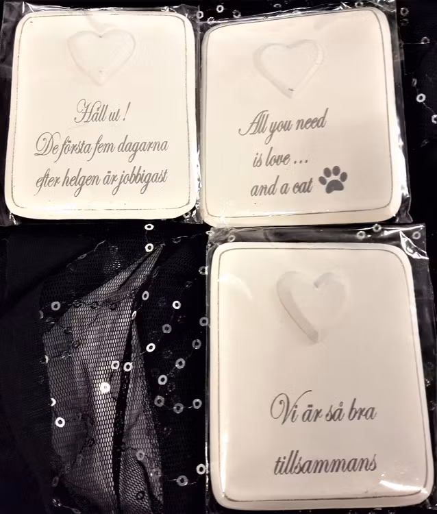 Kylskåpsmagnet med text, 3 varianter Motiv All you need... Vi är så bra... Håll ut!... 29 kr 19 kr Mått 8x7 cm. 3 motiv att välja mellan. Flera populära produkter Snidad handgjord nötknäckare med skål från 59 kr Vinöppnare i plast, 2 varianter från 19 kr Kylskåpsmagnet med djurmotiv och text, 3 varianter från 19 kr Cupcake kakfat grön topp 149 kr Ostbricka i glas med knivar och hyvel 99 kr