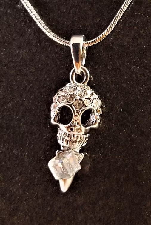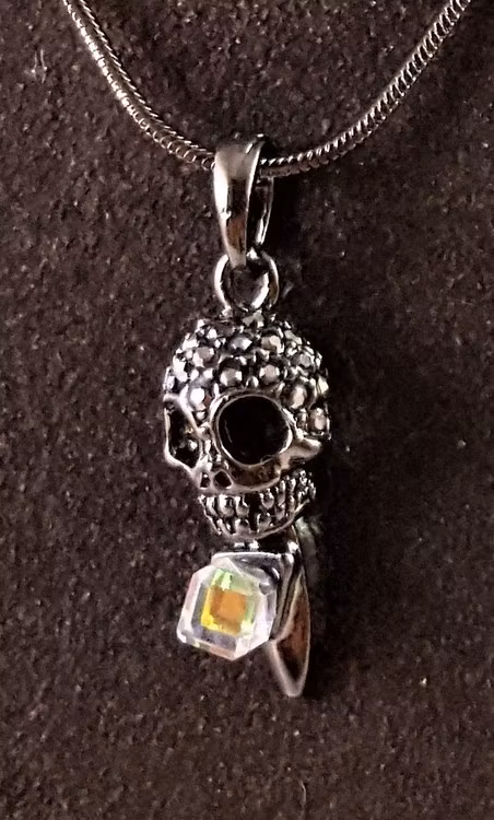 - Stilren halskedja i silverfärg som är utsmyckad med en dödskalle och en fin sten.