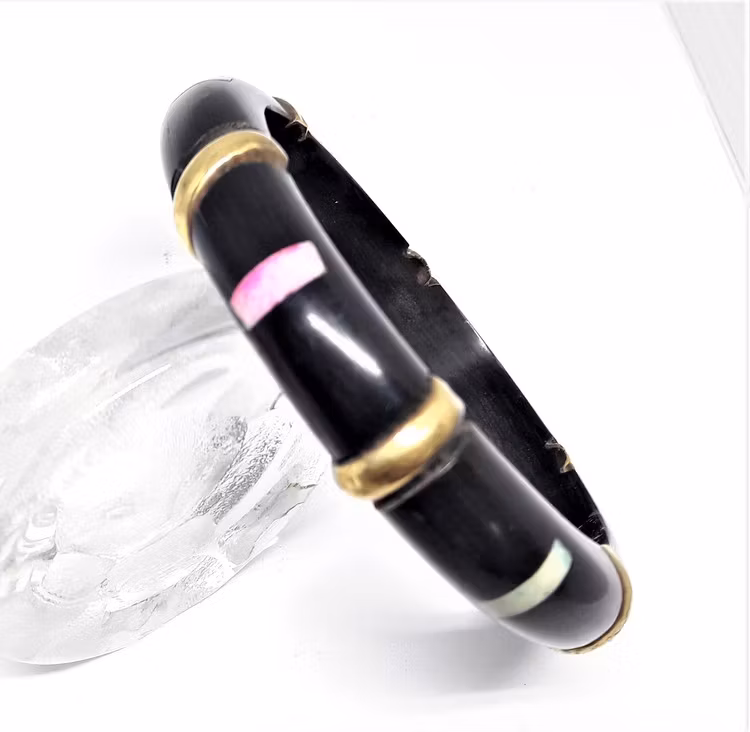 Stelt armband med flerfärgade ränder 50 kr 25 kr Diameter ca 7 cm, bredd ca 2 cm. Handgjort. Variationer förekommer. Flera populära produkter Stelt armband svart/vitt, av buffelben-/horn, H 25 kr Stelt armband svart/vitt, av buffelben-/horn, I 25 kr Stelt armband av trä med färgade inlägg 25 kr Stelt armband av trä med ormskinnsmönster och 3 ränder 25 kr