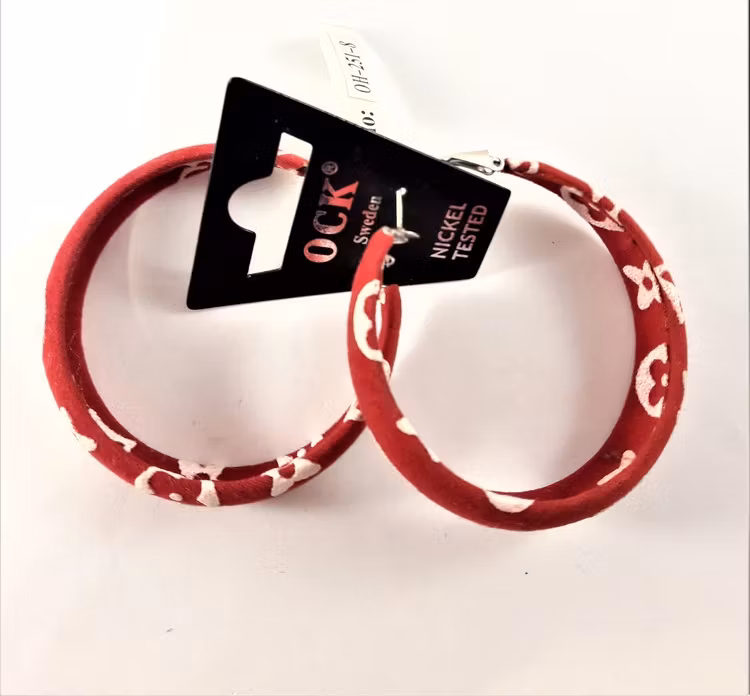 För fina smycken med snyggt mönster rekommenderar vi dessa Runda Tygklädda Örhängen i Röd och Vit, designade av det svenska märket OCK.